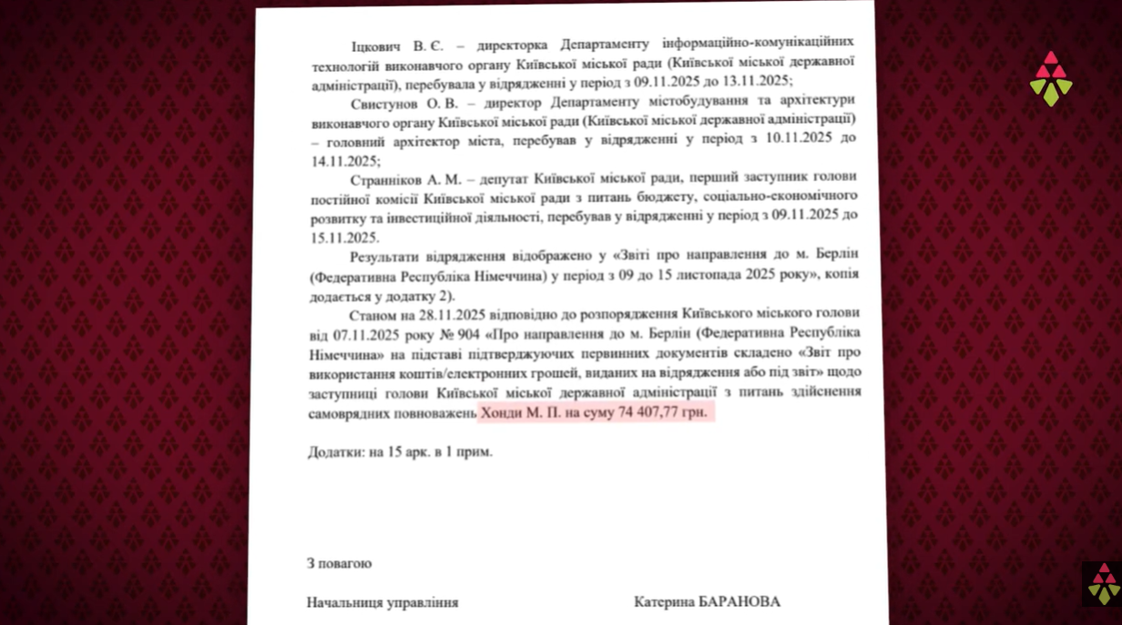 В останньому випуску листопада ми розповідали про закордонне відрядження посадовців КМДА. Представники міської влади на кілька днів вирушили до Берліна на форум, організований за кошти киян – майже 7 мільйонів гривень. І це не всі витрати, які громада оплатила за цю поїздку. Наша редакція подала низку запитів і отримала документи, що підтверджують склад делегації, обсяг витрачених коштів, а також результати цього візиту. Деталі – в новому випуску ютуб-проєкту «В тіні каштана».