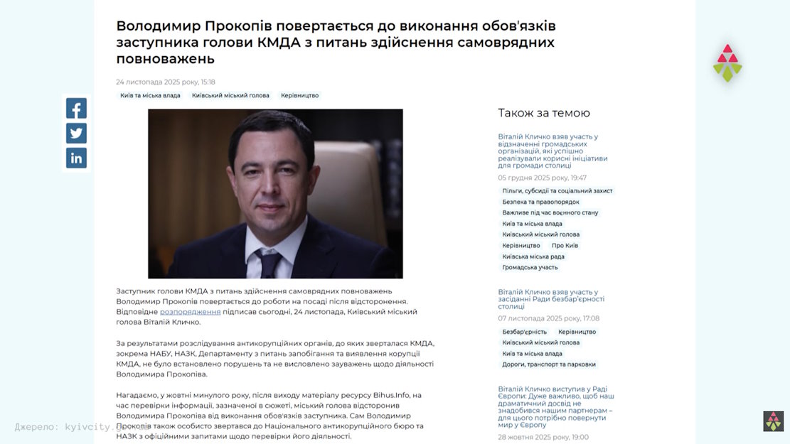 Після цього Віталій Кличко публічно відсторонив Прокопіва від виконання обов’язків, але вже в жовтні так само публічно повернув. Як пояснив тоді голова КМДА, антикорупційні органи, зокрема НАБУ, не встановили порушень у діяльності його заступника та не мають до нього претензій.