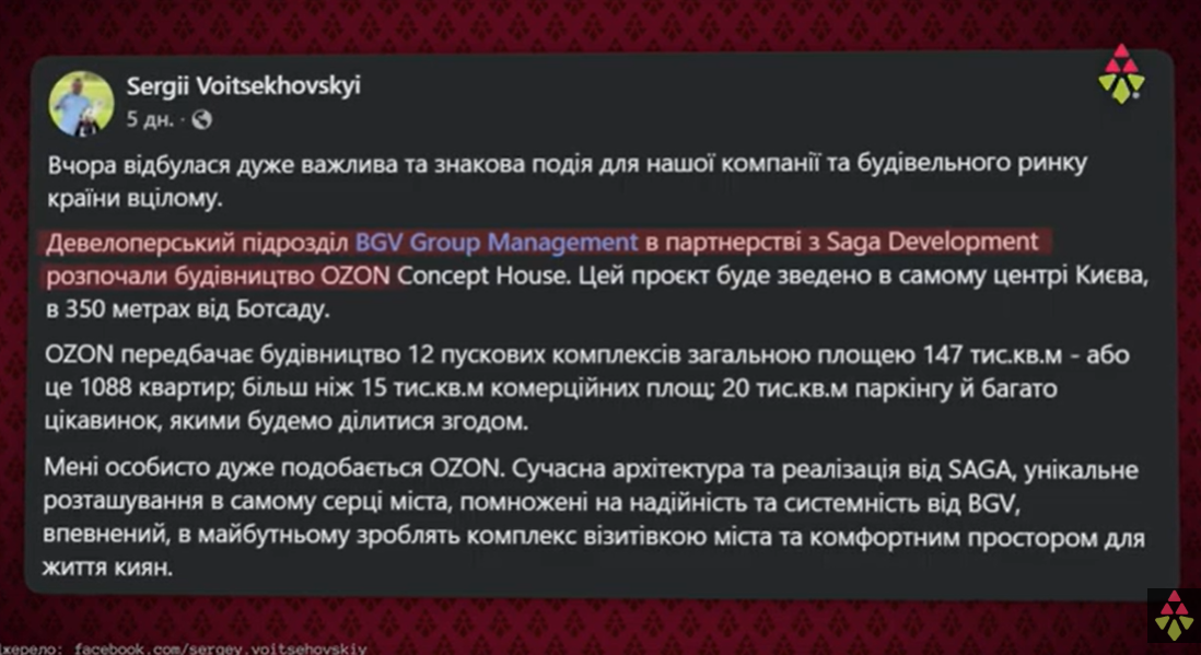 Будівництво ЖК OZON Concept House веде девелоперський підрозділ BGV Group Management в партнерстві зі скандальною компанією Saga Development, яка належить ексзаступнику директора Департаменту містобудування та архітектури КМДА Андрію Вавришу.