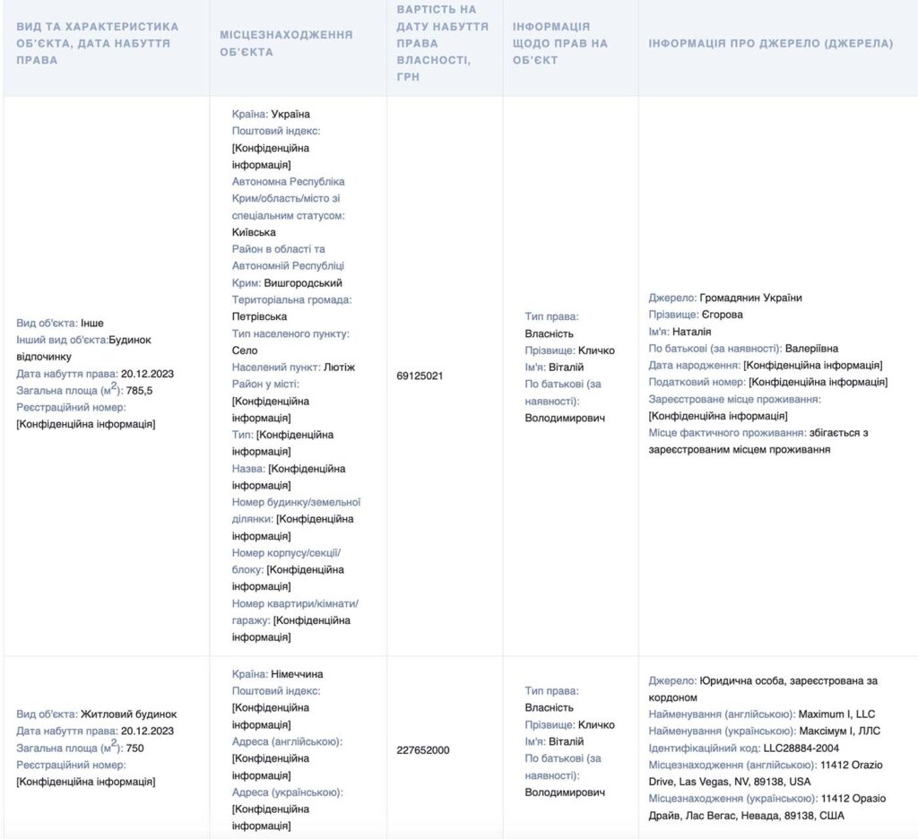 В обмін на розкішний маєток у Німеччині вже колишня дружина Наталія Єгорова передала Віталію Володимировичу у власність будинок відпочинку на Київщині та автівку. Усе це описано в декларації як розподіл активів після розірвання шлюбу.
