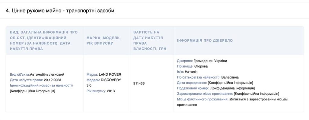 Також зʼявився ще один будинок заміський, у селі Лютіж Вишгородського району. Також у володінні очільника столиці тепер авто LAND ROVER, вартістю майже мільйон гривень.