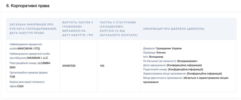 Про те, що власником згаданої компанії є рідний брат мера Києва, можна дізнатися не лише з реєстрів, а й зі ще однієї декларації Віталія Володимировича.