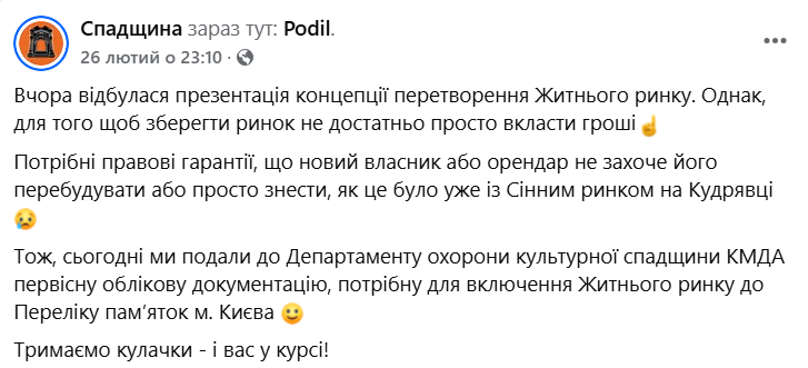 Щоб якось убезпечити майбутнє ринку, активісти ГО «Спадщина» розробили первинну облікову документацію щодо включення цього об’єкта до Переліку пам’яток міста Києва.