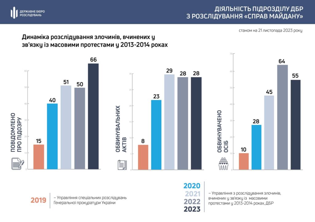 Також цього року за результатами розслідування злочинів, вчинених у зв’язку із масовими протестами у 2013-2014 роках, повідомлено про підозру 66 особам.
