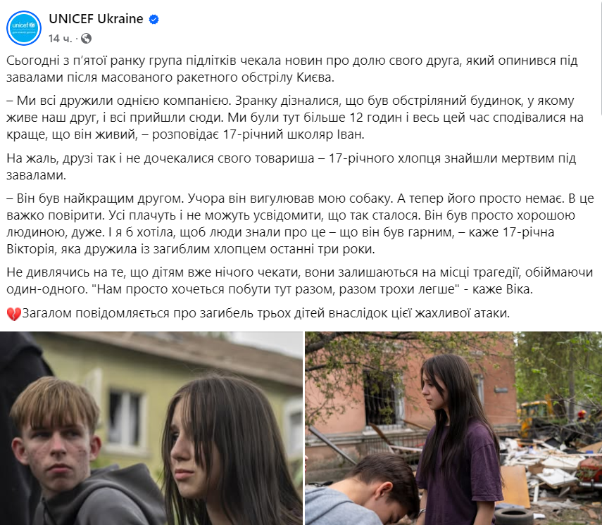 «Світла пам’ять синові Нікіті 2003 року народження, студенту Національного транспортного інституту, та доньці Софії 2005 року народження, випускниці фахового коледжу Київського національного університету технологій та дизайну – КНУТД. Родина Шевченкового університету висловлює найщиріші співчуття Ярославу Володимировичу. Підтримати колегу фінансово можна за номером картки: 5168745177777064», – йдеться у дописі.
