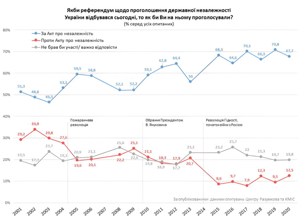 «Якби референдум про державну Незалежність України відбувався сьогодні, абсолютна більшість українців (82%) підтримали б Незалежність України», — констатували науковці.