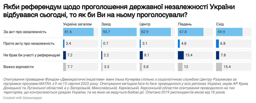 За результатами соціологічного дослідження, найбільше тих, хто підтримав би Незалежність, — на Заході нашої країни (94%), на Півдні та Сході відповідно — 68% і 70%.