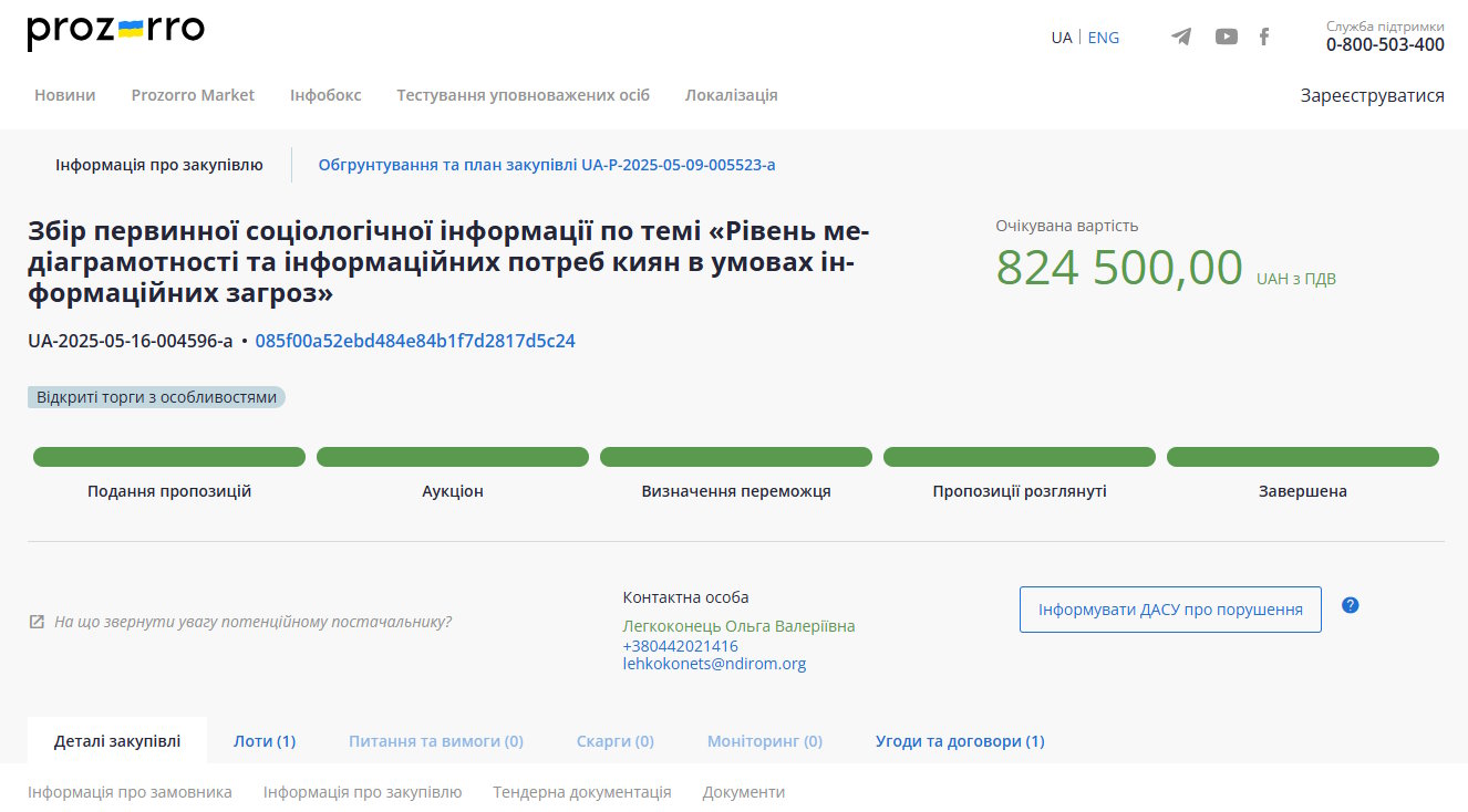 Цього разу послуга передбачає збір первинної соціологічної інформації на тему: «Рівень медіаграмотності та інформаційних потреб киян в умовах інформаційних загроз». Про це інформує Прозоро.