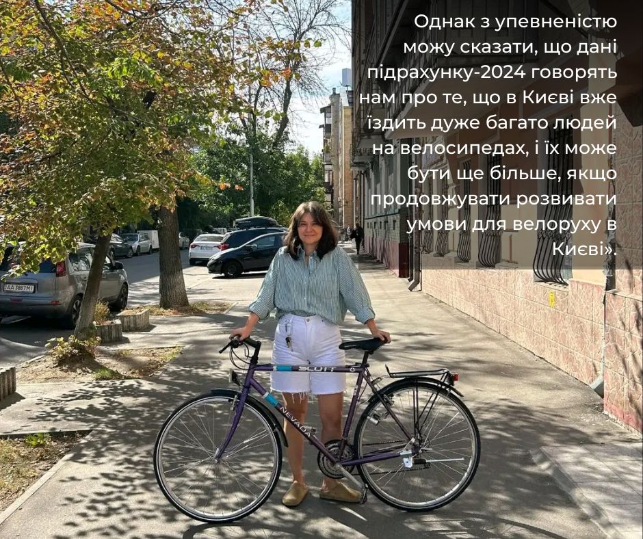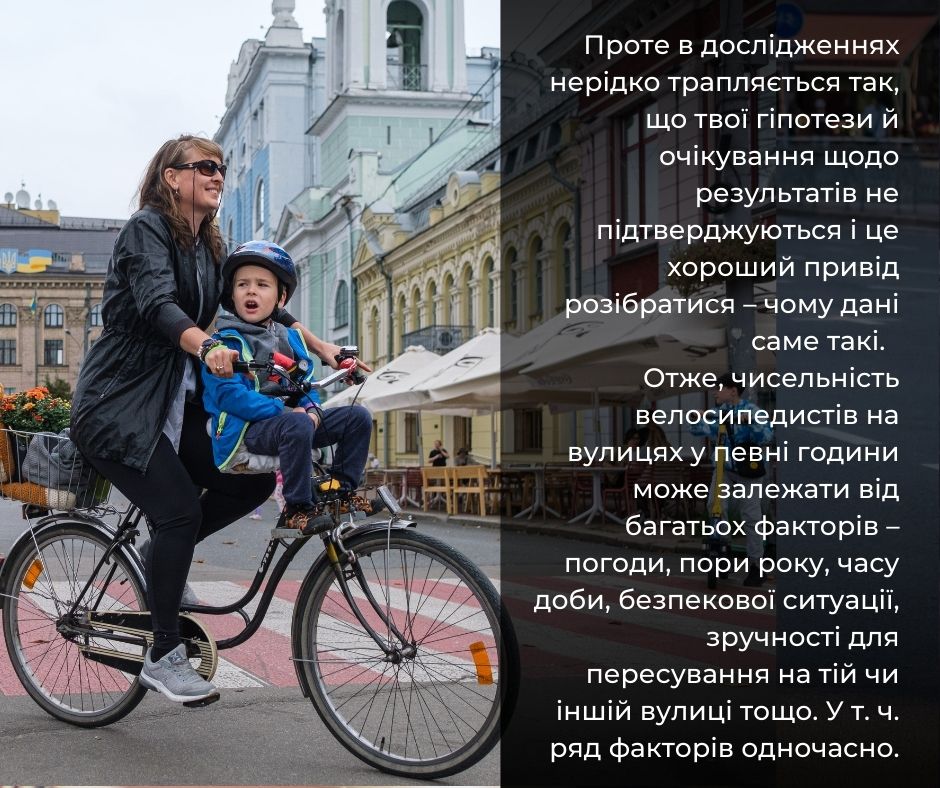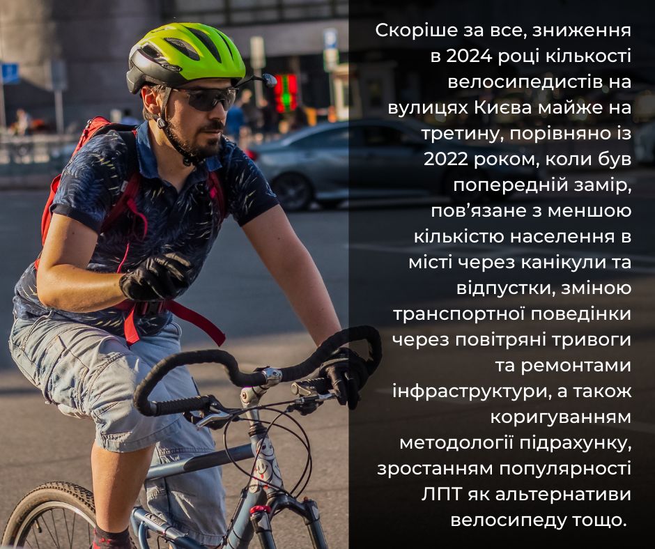 Як зазначають її аналітики, якщо порівнювати результати підрахунку велосипедистів у 2024 році з показниками 2022-го, то спад є досить суттєвим. Така тенденція може бути спричинена зовнішніми обставинами: повітряними тривогами, які впливають на рішення власника велосипеда їхати або не їхати, відпустками та змінами в методології дослідження. Водночас погодні умови не є факторами впливу на зменшення велотрафіку.