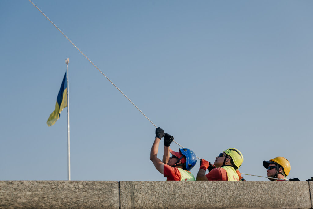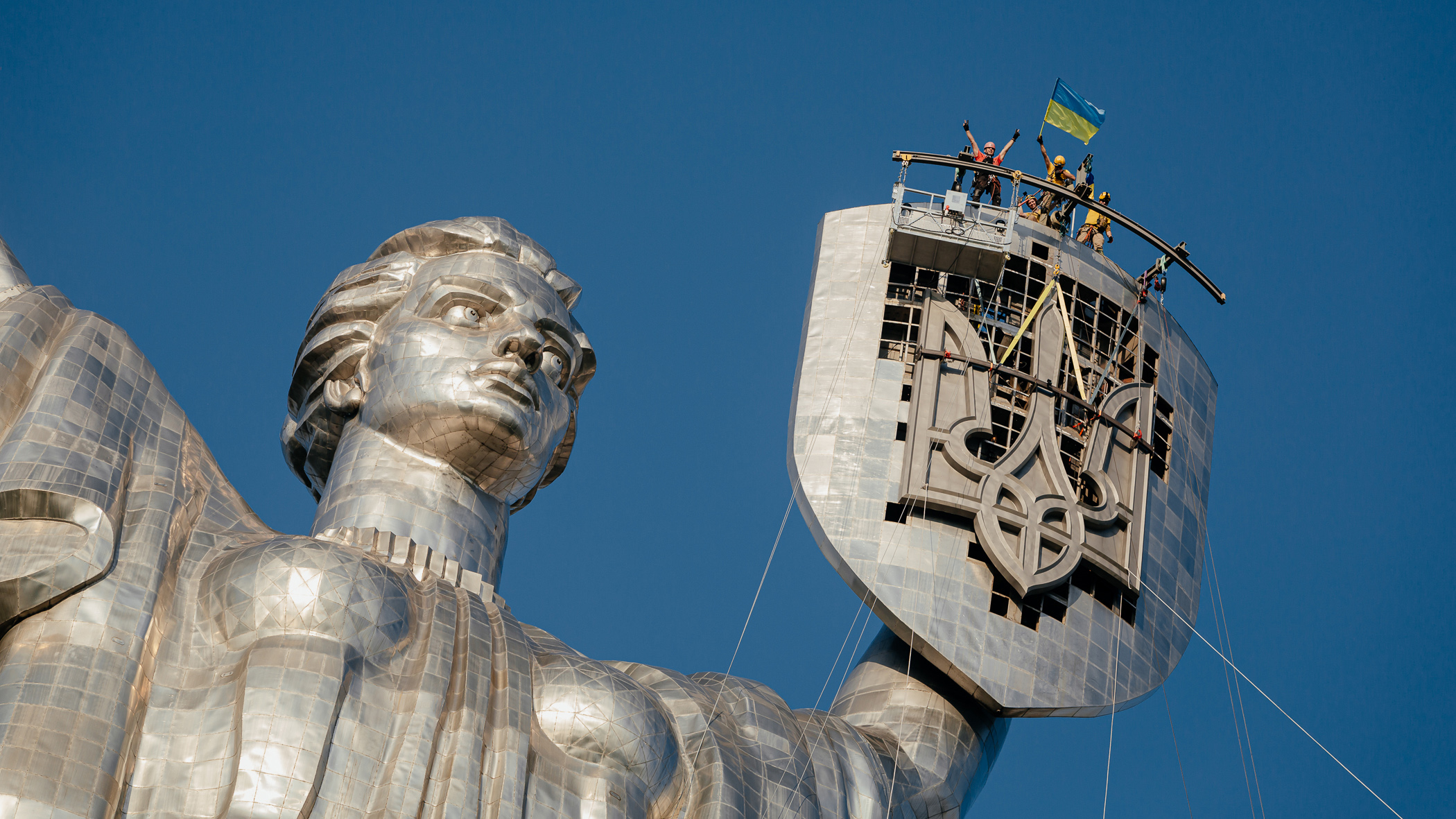 Роботи мали розпочатися о 16:00 5 серпня, але через повітряні тривоги та сильний шквалистий вітер їх довелося декілька разів відкладати. Врешті-решт герб почали піднімати на монумент лише близько 21:00.