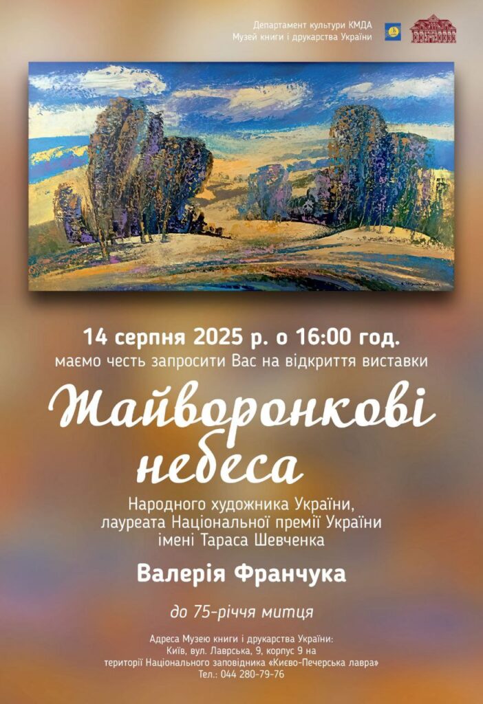 Сьогодні, 14 серпня, о 16-ій годині, у Музеї книги і друкарства України відкриють виставку Народного художника України, лауреата Національної премії імені Тараса Шевченка Валерія Франчука «Жайворонкові небеса»