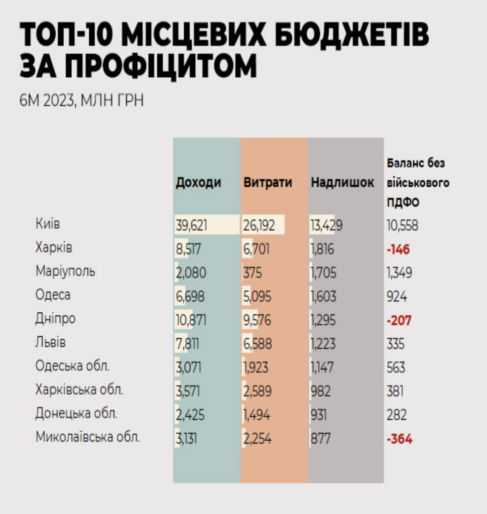 Лідером з профіциту традиційно є Київ – 13,4 млрд грн, з яких майже 3 млрд припадають на «військовий» ПДФО.