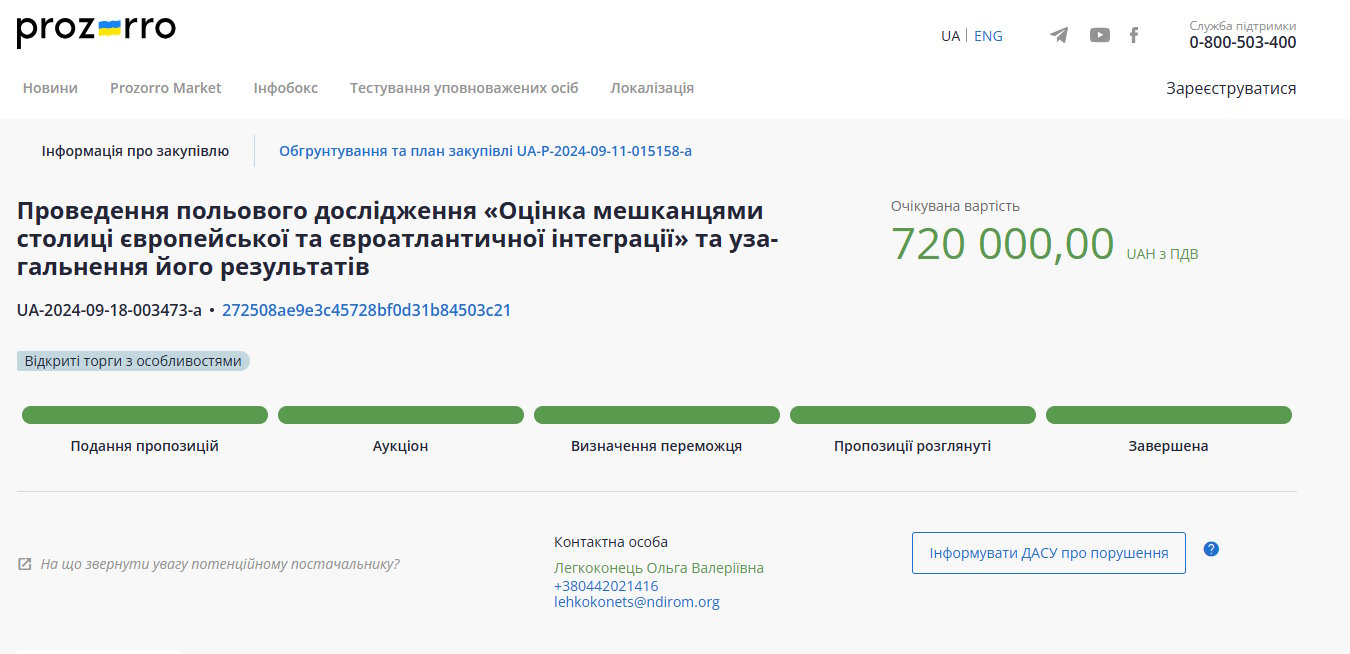 Це КП забажало провести дослідження на тему: «Збір первинної соціологічної інформації по темі «Моніторинг сприйняття мешканцями столиці європейської та євроатлантичної інтеграції». 20 жовтня було оголошено тендер на 785 тисяч гривень.