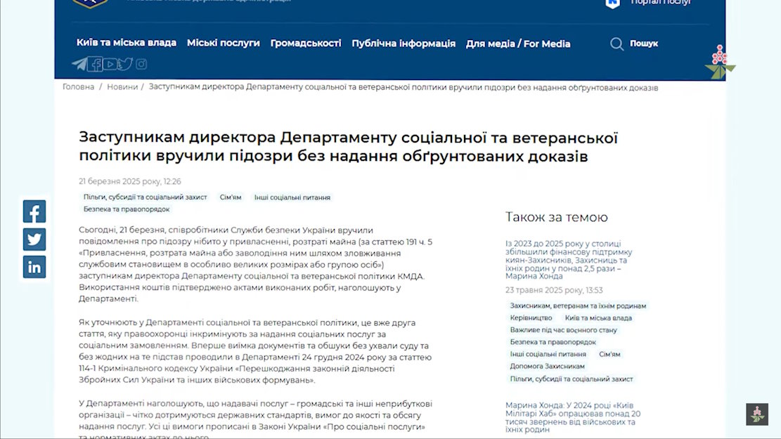 Чому журналісти мають обґрунтоване переконання, що довідка підроблена? А тому, що в Департаменті соціальної та ветеранської політики КМДА за це вже вручали підозру. Власне, директору – Руслану Світлому. Його звинуватили в отриманні «липової» інвалідності ще в грудні 2024-го року.
