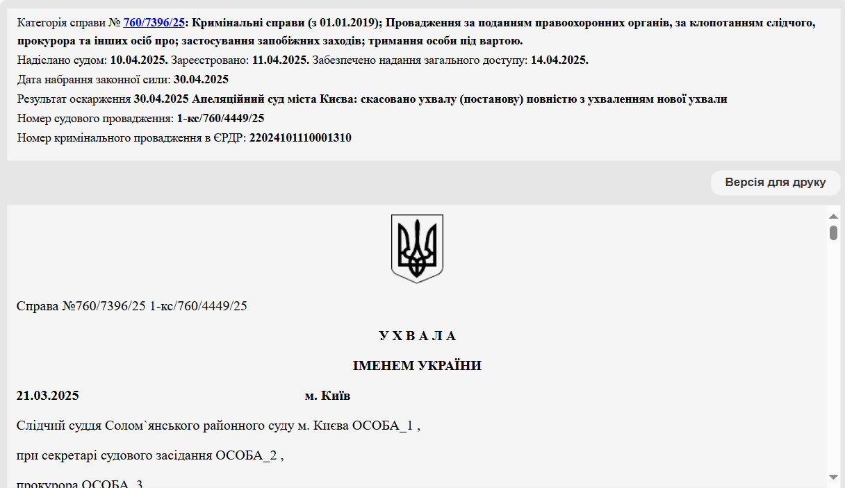 «ОСОБА_5 , перебуваючи на посаді заступника директора охорони здоров`я КМДА – начальника управління економіки та заступника директора КНП «Клінічна лікарня «Психіатрія», організував та забезпечив втілення схеми з протизаконного виведення бюджетних коштів на власну користь, а також на користь ТОВ «Міцне здоров’я». В невстановлений час, але не пізніше 30.12.2021 у громадянина України ОСОБА_5 , виник злочинний умисел, направлений на заволодіння бюджетними коштами, які виділяються в якості компенсації наданих соціальних послуг паліативного догляду у межах виконання міської цільової програми «Турбота. Назустріч киянам» на 2022-2024 роки, вчиненому організованою групою», – йдеться в ухвалі Солом’янського районного суду м. Києва.