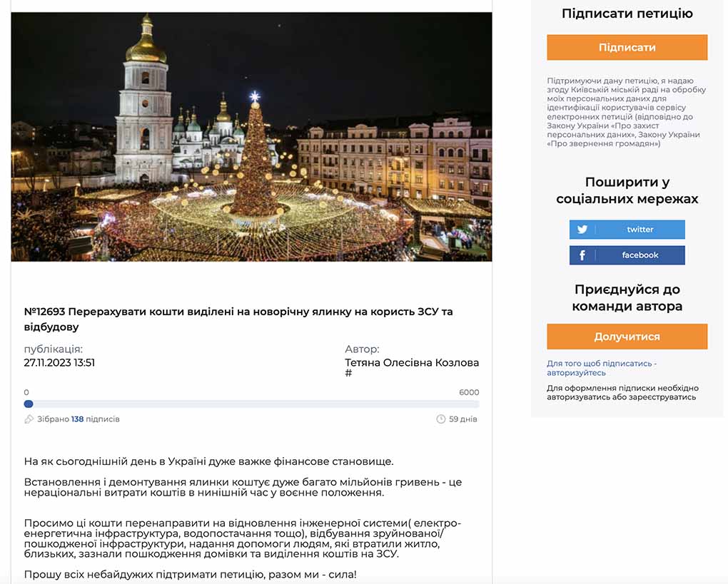 На сайті Київради з’явилася електронна петиція з пропозицією перерахувати кошти, виділені на встановлення ялинки на Софійській площі, на ліквідацію наслідків російського вторгнення та на потреби ЗСУ.