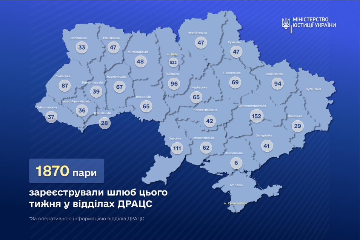 За кількістю одружень лідирують три регіони: Київ – 522, Дніпропетровська область – 152, Одещина – 111, повідомляє Міністерство юстиції.