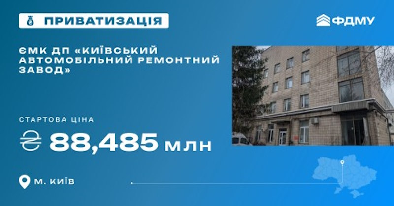 Онлайн-аукціон з приватизації відбудеться 27 травня у системі «Прозорро.Продажі». Стартова ціна лота — 88,485 млн грн.