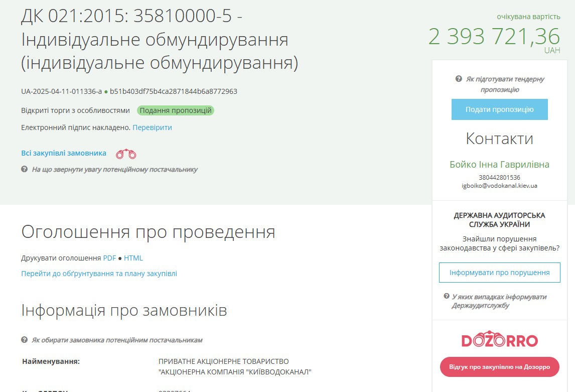 Керівництво Акціонерної компанії «Київводоканал» вирішило оновити робочі спецзасоби захисту для працівників, за що готове викласти понад 2,3 мільйона гривень.