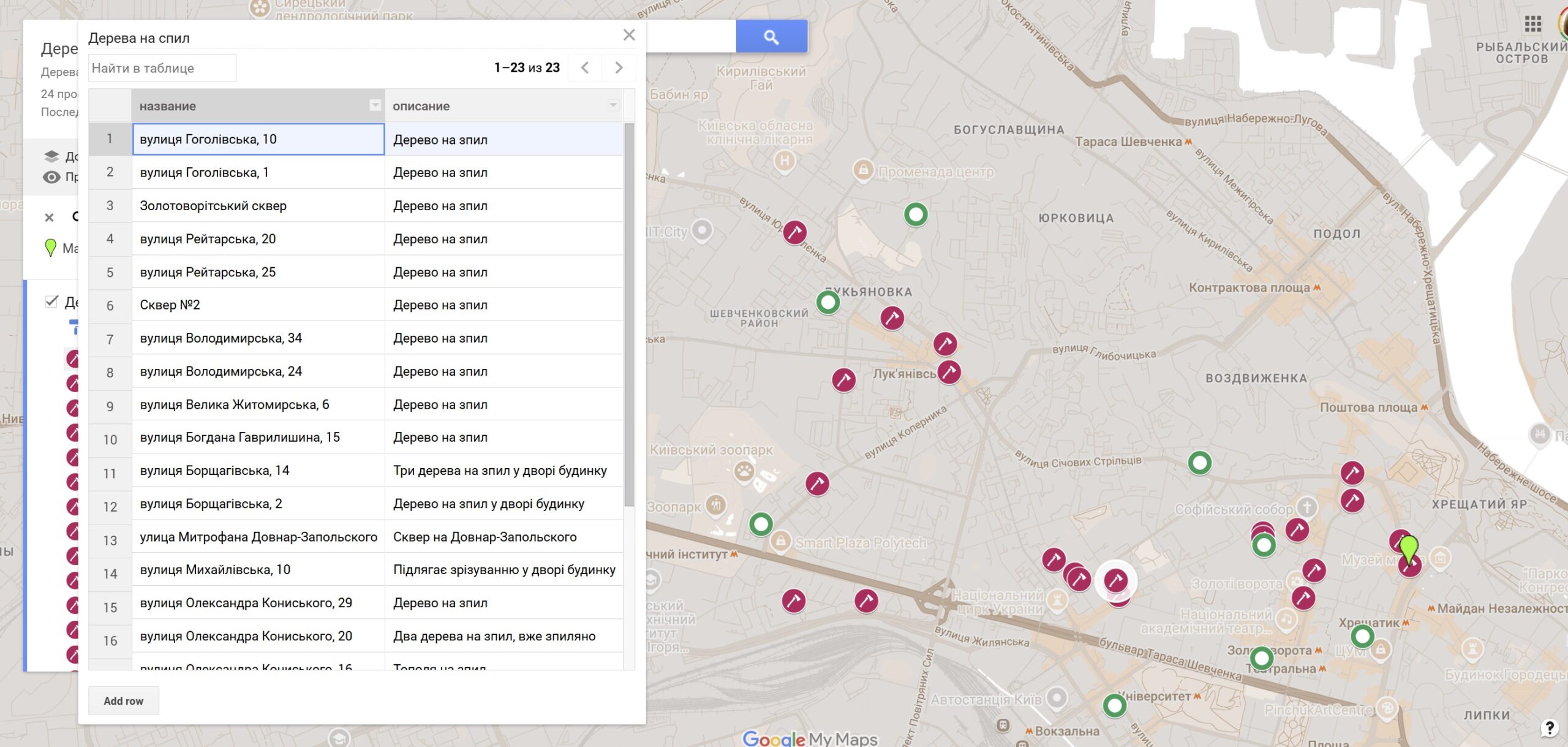 Вона створила мапу, де нанесено місця запланованої вирубки. Для прикладу – 23 локації лише в Шевченківському районі.