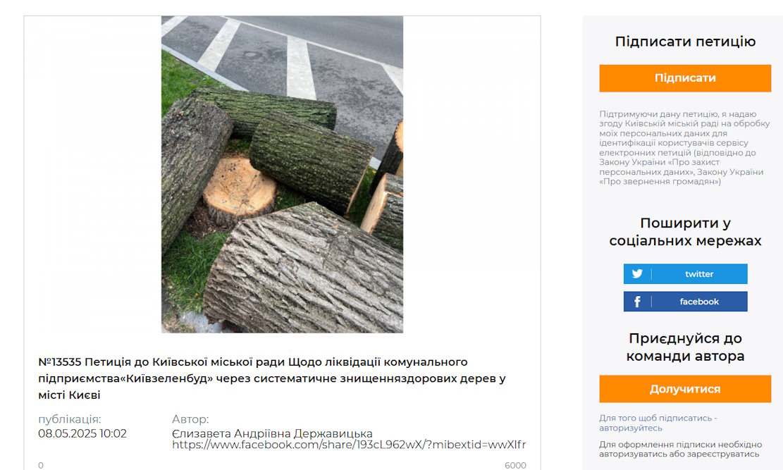 Обурені знищенням зелених насаджень, кияни створили петицію з вимогою ліквідувати «Київзеленбуд» — підприємство, яке, на їхню думку, замість догляду за парками й скверами, систематично нищить зелені зони столиці.