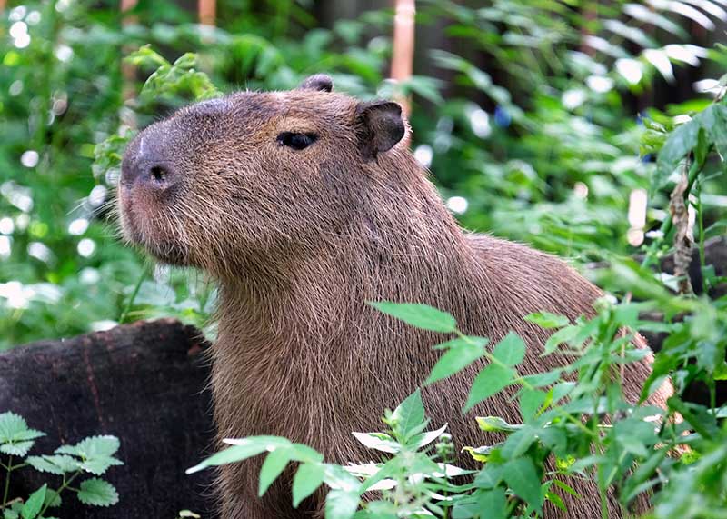 Побачити київських капібар можна на їхній літній «фазенді» з живими деревами, кущами, квітами та басейном з водограєм, розташованій наприкінці копитного ряду біля слоновника.