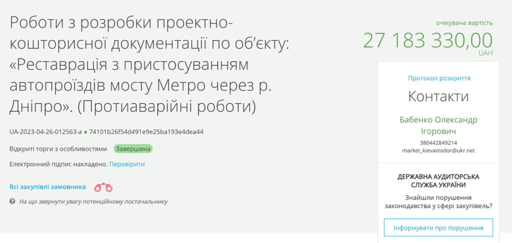 Станом на 2024 рік жодних досліджень не проведено, міст «Метро» ще в 2018 році був за крок від максимального рівня аварійності. Що з ним зараз і чим це може загрожувати – знають лише у КМДА. Навесні 2023 року «Київавтодор» оголосив тендер на розроблення проєктної документації для ремонту мосту. Його виграла компанія «Сінк Плюс Міжнародна інжинірингова і консалтингова компанія». Вона запропонувала виконати роботи за 22,56 млн гривень, але очікувана вартість зазначається більше 27 мільйонів гривень.