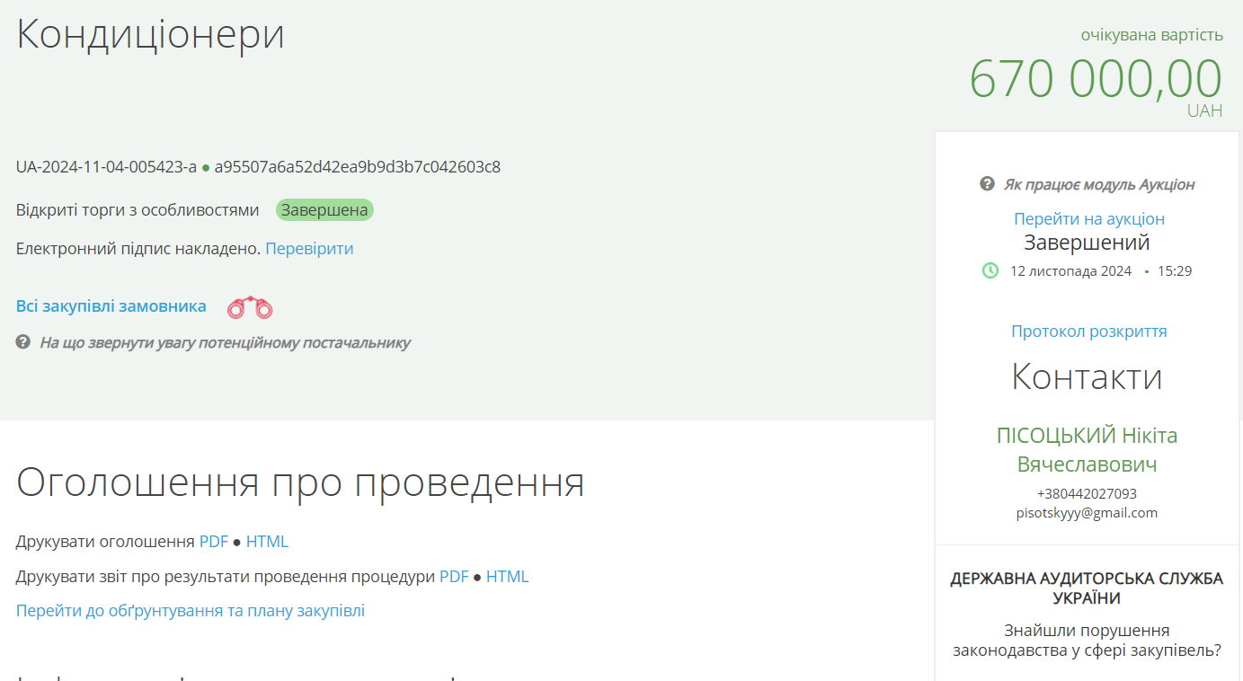 На Хрещатику, 36 вирішили, що потребують 33 нових кондиціонери. Згідно з інформацією про конкурс, на це витратили пів мільйона гривень.