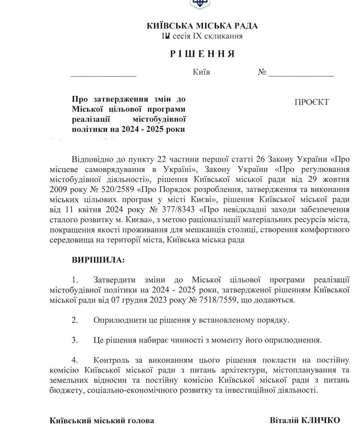 Київрада внесла зміни до програми реалізації містобудівної політики на 2024-2025 роки, збільшивши її фінансування більше ніж удвічі — з 66,5 до 172 мільйонів гривень.