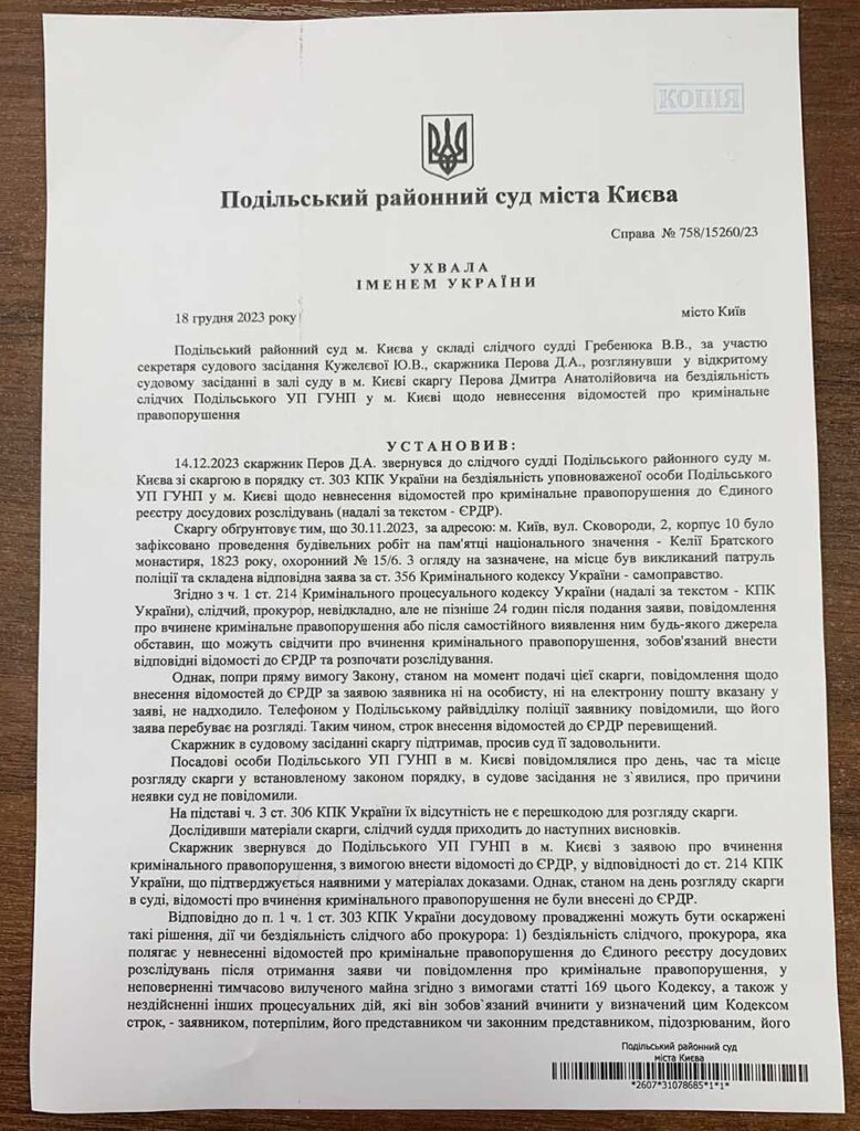 Це тривало, поки Подільський районний суд зобов’язав Національну поліцію відкрити кримінальне провадження за фактом проведення самоправних робіт на памʼятці національного значення. Для полегшення роботи суд навіть указав поліцейським статтю, за якою порадив їм розпочати провадження — 356 Кримінального кодексу України.