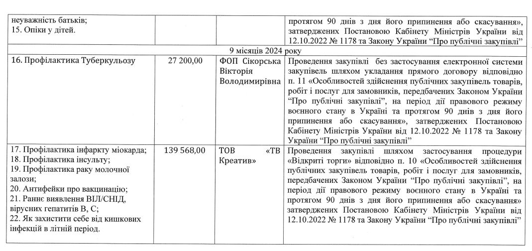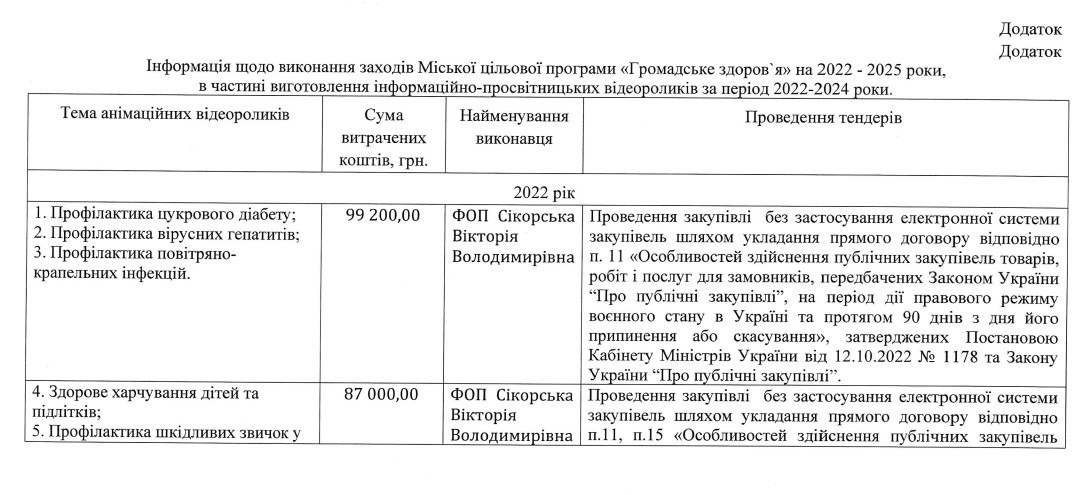 Наприклад, у 2022 році за три відеоролики («Профілактика цукрового діабету», «профілактика вірусних гепатитів», «профілактика повітряно-крапельних інфекцій» з бюджету Cікорській було заплачено 99 тисяч 200 гривень. А за ролик «Профілактика туберкульозу» цьогоріч було заплачено 27 тисяч 200 гривень.