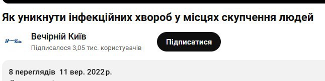 Відеоролик «Як уникнути інфекційних хвороб у місцях скупчення людей» (створено 11 вересня 2022 року), на Ютюбі «ВК» має усього 8 переглядів. На що медики – замовники цієї інформаційної продукції – радять звернути увагу киян? Здебільшого, на загальновідомі речі: «Мийте руки перед їжею», «Не торкайтеся обличчя руками» тощо.