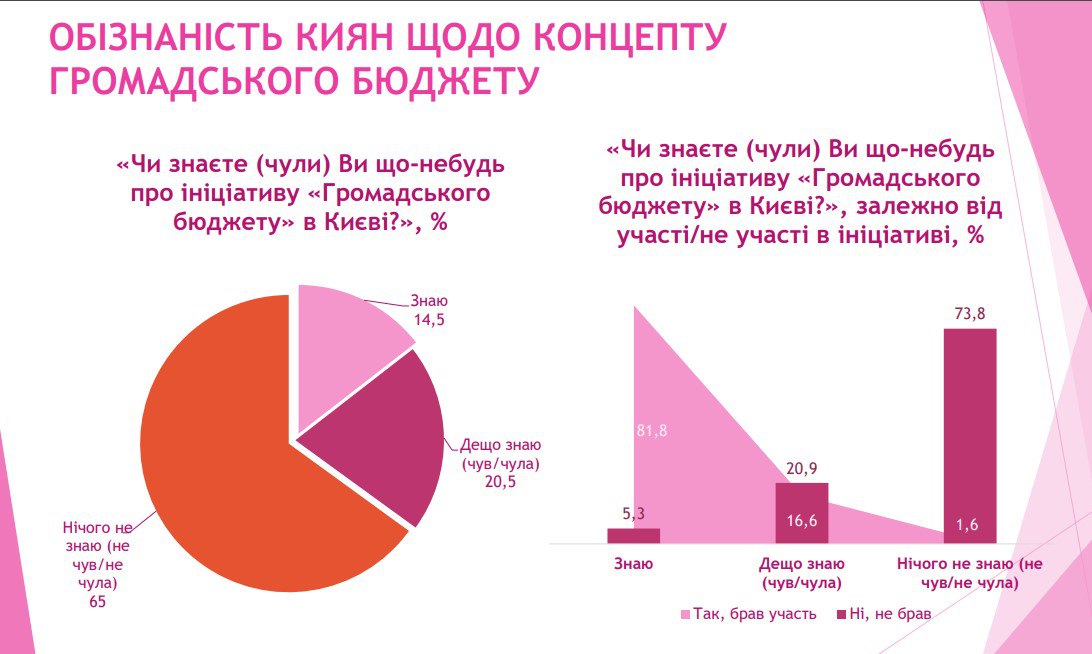 А ось дані про обізнаність киян щодо «Громадського бюджету»: 65 відсотків опитаних нічого не чули про це.