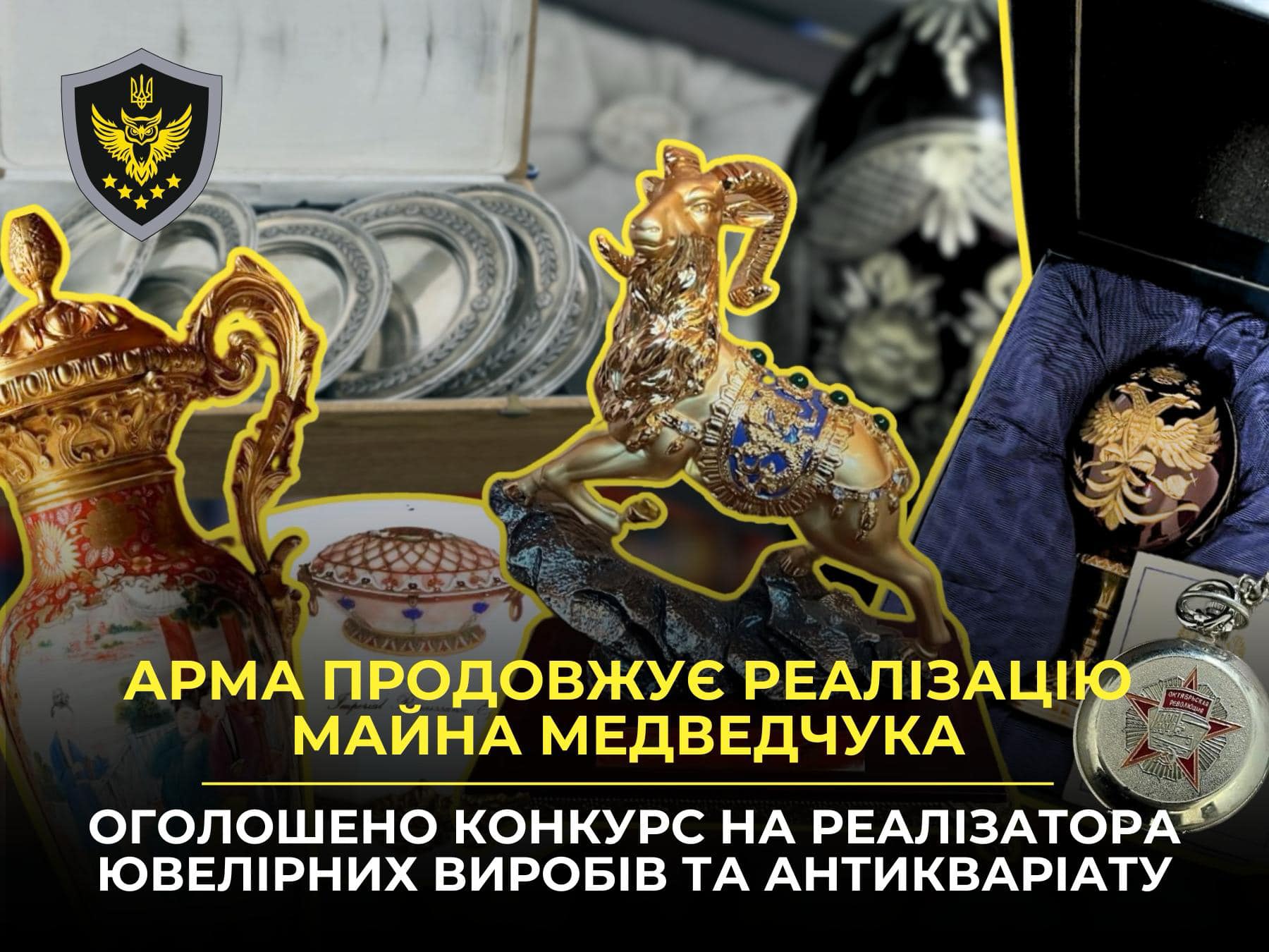 Національне агентство з питань виявлення, розшуку та управління активами, одержаними від корупційних та інших злочинів (АРМА ) оголосило конкурс на організатора реалізації ювелірних виробів, антикваріату та інших коштовностей, вилучених у резонансній справі. Майно включає унікальні ювелірні вироби, зокрема, відомі екземпляри «Faberge» та «Cartier», а також антикварні ікони, монети, статуетки й годинники.