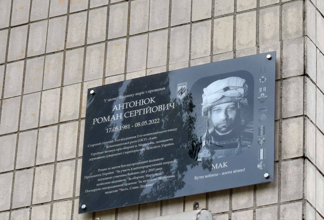 «Ми продовжуємо вшановувати пам’ять наших Героїв. На честь бійця Окремого загону спеціального призначення НГУ «Азов» Романа Антонюка, разом із його сім’єю та друзями, ми відкрили меморіальну дошку», – сказав очільник РДА. Він нагадав, що кілька місяців тому на честь Романа створили шкільний музей «Незламна Україна» на базі ліцею №157, де навчався Герой. На чільному місці в експозиції – особисті речі захисника.