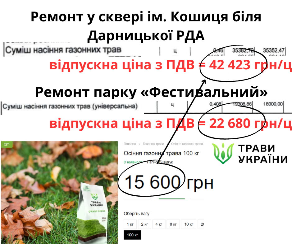 Аналітики видання «Наші гроші» побачили такі дивні видатки, як ремонт скверу на перетині вулиці Кубанської України, 20, та проспекту Лісового, 31, у Деснянському районі – тут у вартість ремонтних робіт врахували навіть арт- об’єкт «Я люблю Лісовий» за 643 080 грн/шт.