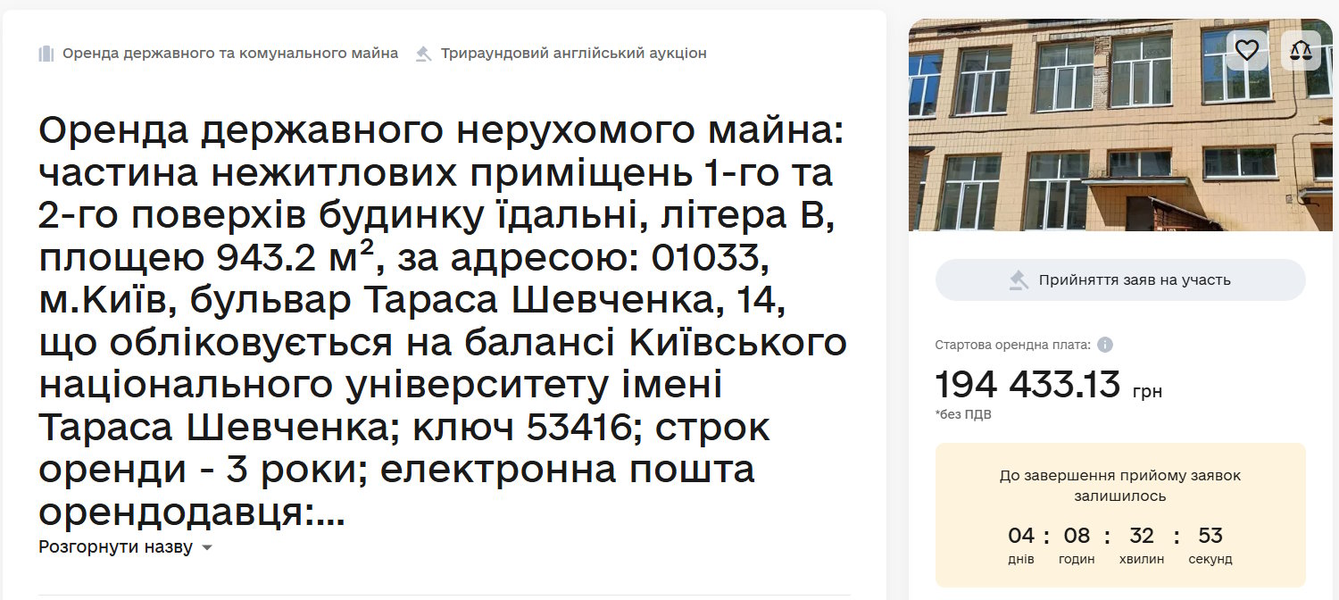Два поверхи нежитлового приміщення обліковуються на балансі Київського національного університету імені Тараса Шевченка. Нерухомість виставляють на аукціон для передачі в оренду на три роки. Загальна площа – 943,2 квадратних метра.