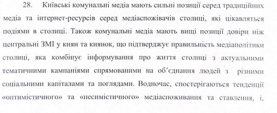 «київські комунальні медіа мають сильні позиції серед традиційних медіа та серед медіаспоживачів столиці… Також комунальні медіа мають вищі позиції довіри, ніж центральні ЗМІ у киян та киянок, що підтверджує правильність медіаполітики столиці…».