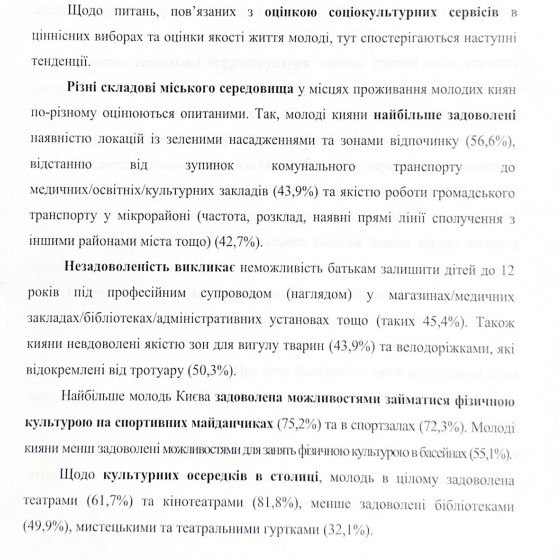 «Молоді кияни найбільше задоволені наявністю локацій із зеленими насадженнями та зонами відпочинку… та якістю роботи громадського транспорту у мікрорайоні…».