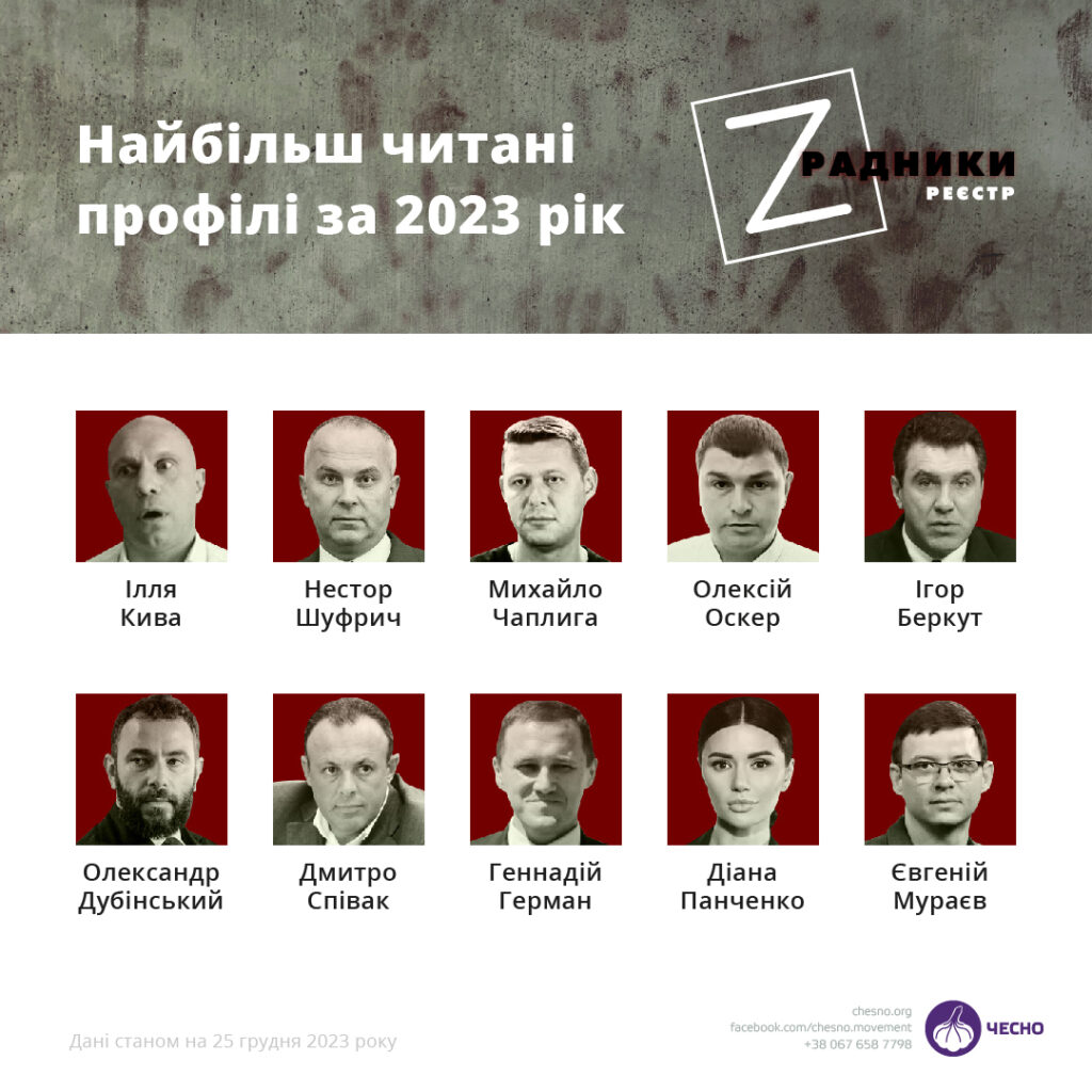 Як встановили аналітики Руху ЧЕСНО, найчастіше впродовж минулого року користувачі шукали інформацію про ліквідованого екснардепа Іллю Киву та депутатів, які потрапили до СІЗО: Нестора Шуфрича, Олександра Дубінського, Дмитра Співака, а також правоохоронця Геннадія Германа та п’ятьох медійників – Михайла Чаплигу, Євгена Мураєва, Діану Панченко, Олексія Оскера та Ігоря Беркута.