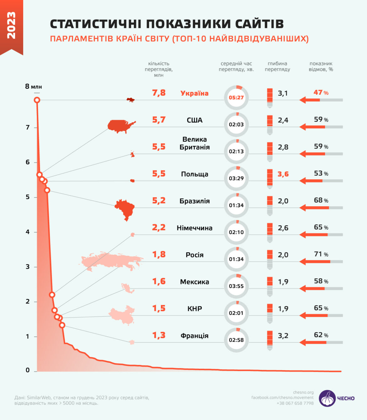 Також не зайвим буде зауважити, що сайт Верховної Ради крім рекордної кількості переглядів протягом місяця має найбільший час перебування на сайті серед країн першої десятки. Крім того, він має найменший показник відмов, а за глибиною перегляду входить до трійки лідерів.