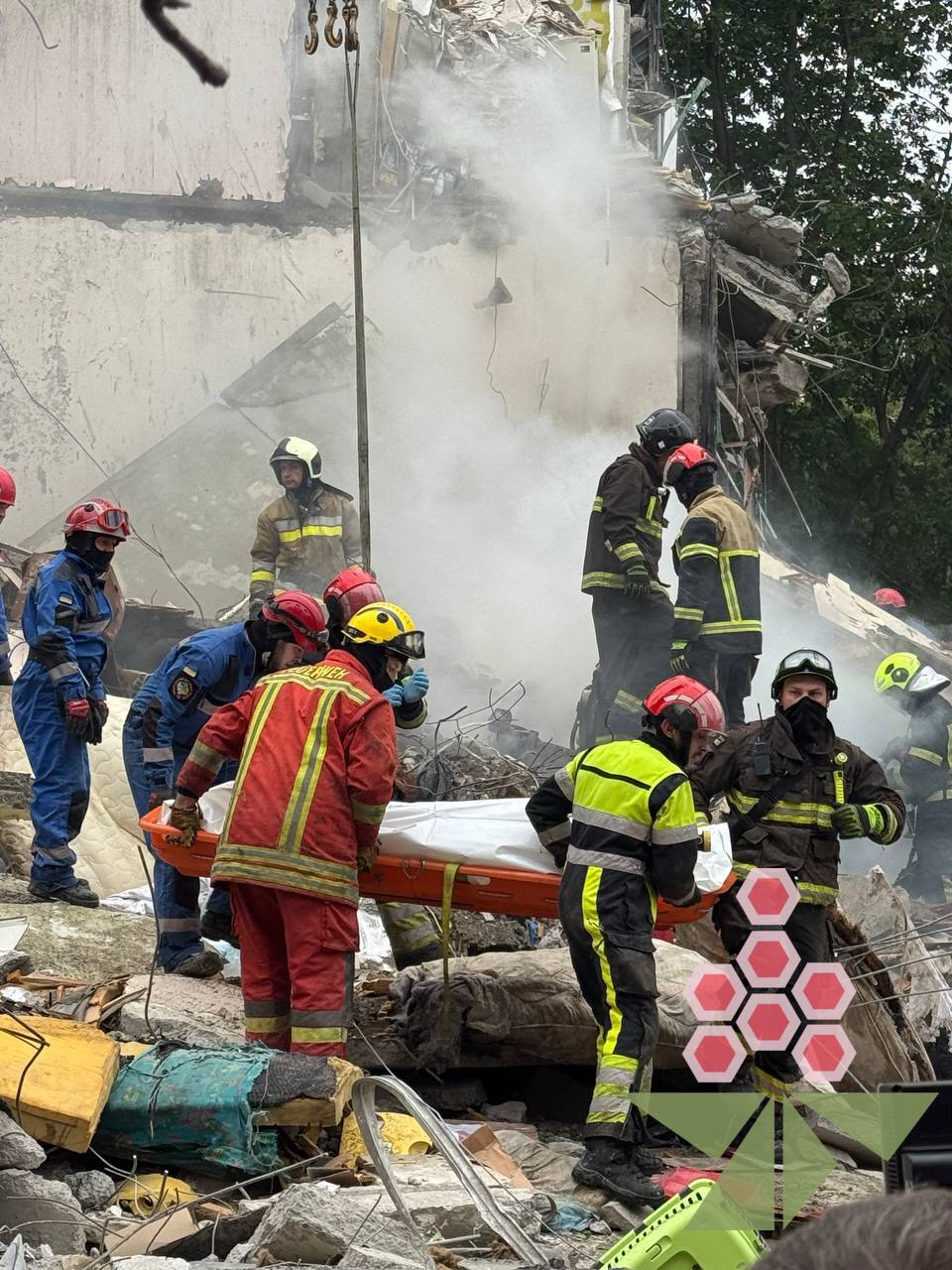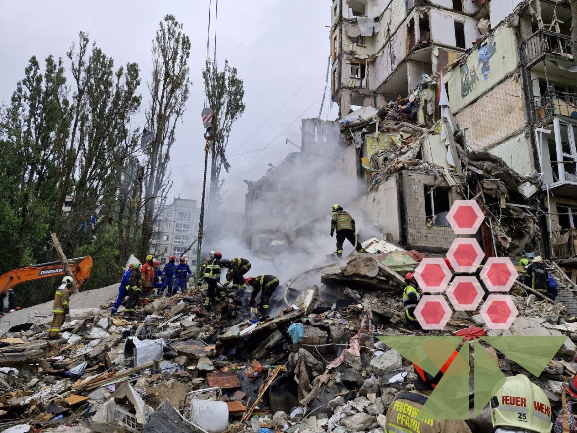 Ракета знищила під’їзд дев’ятиповерхівки в Святошинському районі. Загалом пошкоджено понад сто об’єктів: житлові будинки, школи, садочки, лікарні, університет. На місці працюють рятувальники, медики, ДСНС та керівництво міста. Дані — не остаточні, інформує начальник КМВА Тимур Ткаченко.