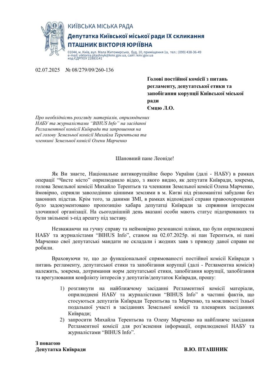 «Саме тому, керуючись інтересами громади м. Києва, звернулась до Регламентної комісії з проханням запросити діючих (!!!) голову земельної комісії Терентьєва та членкиню цієї ж комісії Оксану Марченко на наше засідання», – повідомила депутатка.