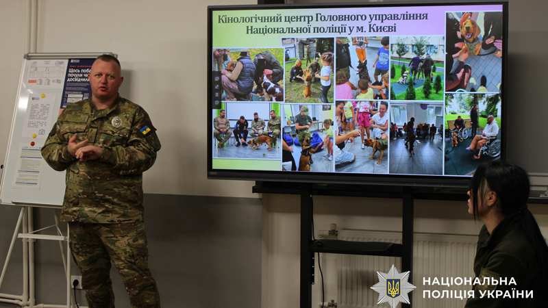 У Києві правоохоронці разом із службовими собаками взяли участь у заході з пет-терапії для студентів Маріупольського державного університету, розповівши як взаємодія з тваринами допомагає долати наслідки війни
