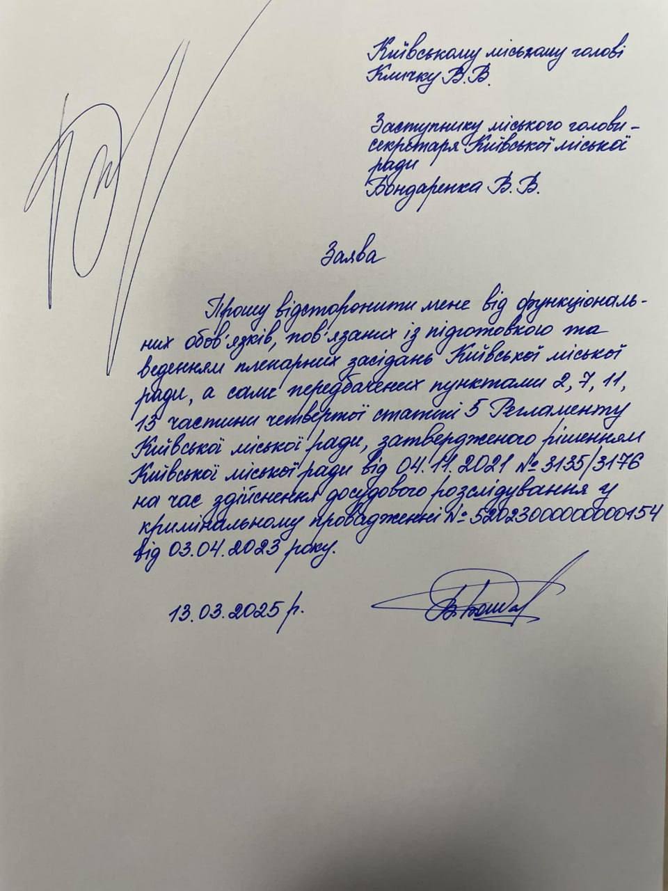 Заступник Київського міського голови-секретар Київради Володимир Бондаренко написав заяву з проханням відсторонити його від обов’язків, пов’язаних з підготовкою та проведенням засідань сесій міської ради на період досудового розслідування