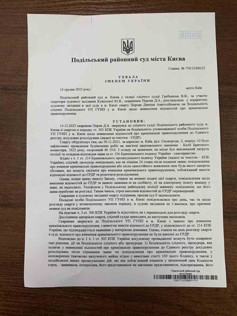 «Подільський районний суд м.Києва зобов’язав Національну поліцію відкрити кримінальне провадження щодо проведення самоправних робіт на памʼятці національного значення — Братські Келії, 1823 р. — ст. 356 КК України», — написав Перов.