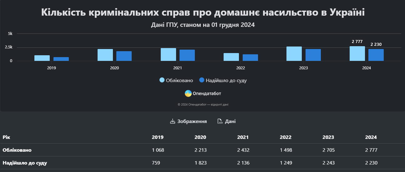 Водночас, за даними правоохоронців, упродовж 11 місяців 2024 року в Україні відкрито 2777 кримінальних проваджень щодо домашнього насильства.