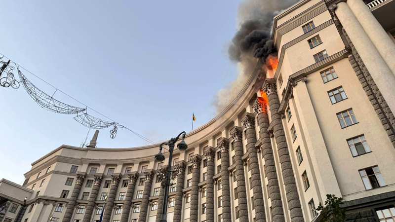 Внаслідок російської атаки постраждала будівля Кабінету Міністрів України: вогонь охопив кілька поверхів і дах.