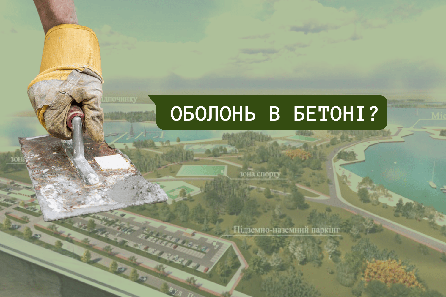 У районі вулиці Прирічної на Оболоні заливають бетоном берегову лінію та зелену зону. Міська влада обіцяла зробити тут парк із дитячими майданчиками та озелененням за кошти меценатів, однак, судячи з тендерної документації, за роботи знову платить місто.
