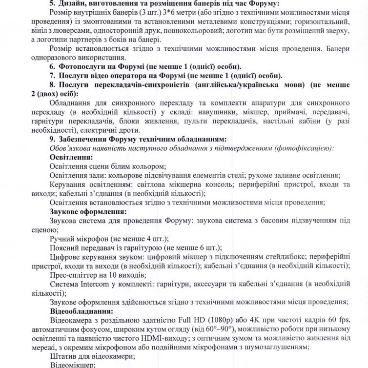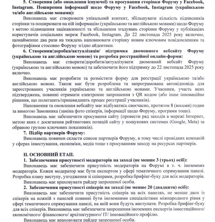 Поцікавимося, який обсяг робіт повинні були виконати виконавці за ці кошти. У специфікації до угоди зазначено, наприклад, що фірма зобов’язувалася розробити текст запрошень на форум, підготувати пресреліз, розмістивши цей текст не менш як у двох загальнонаціональних та столичних ЗМІ, створити та просувати сторінку форуму в Інстаграмі та Фейсбуку. А ще – створити (актуалізувати) двомовний вебсайт форуму, забезпечити його просування в інтернеті. У специфікації йдеться і про розміщення та виготовлення банерів, і про відео, – та фотоозйомки, і про забезпечення форуму технічним обладнанням.
